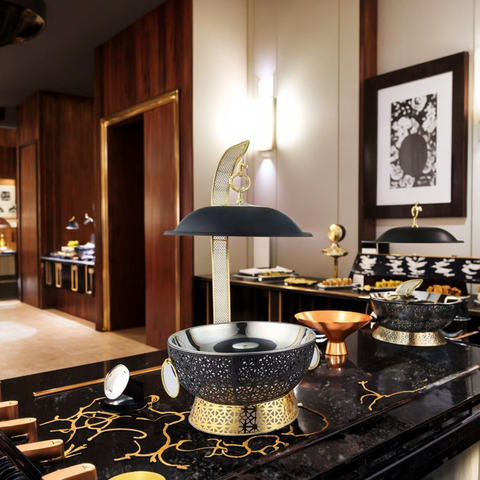 Calentador de alimentos de buffet alimentado con alcohol de 9L de plato de frotamiento de acero inoxidable negro de lujo para hotel y restaurante
